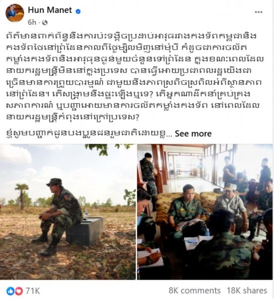 洪瑪奈在社交媒體上發(fā)文說(shuō),“我希望柬泰兩國(guó)陸軍高層今天的會(huì)談能夠取得積極成果,一如既往地保持雙方前線(xiàn)部隊(duì)間的和平與良好溝通”。