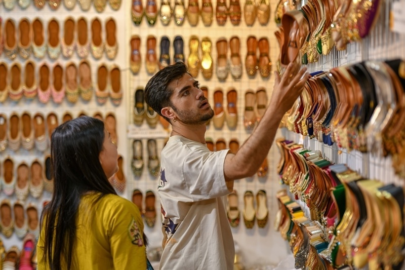 2025年6月19日,在第9屆中國(guó)—南亞博覽會(huì),巴基斯坦展區(qū)的參展商(右)向一名顧客推介特色鞋。新華社發(fā)(彭奕凱 攝)