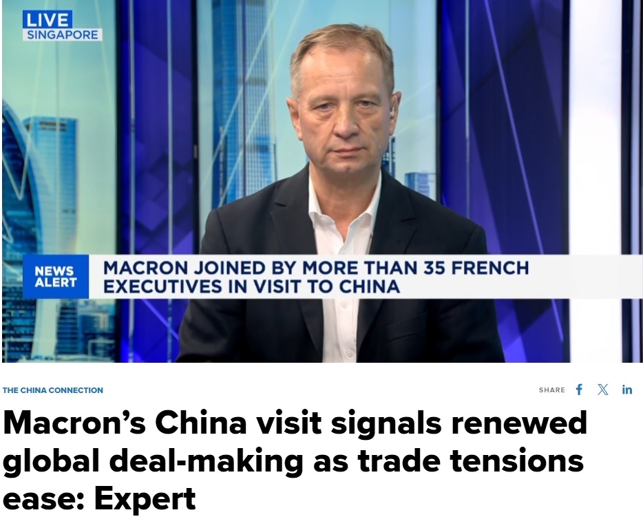 近日,法國總統(tǒng)馬克龍的訪華之行引發(fā)國際社會(huì)廣泛關(guān)注。美國消費(fèi)者新聞與商業(yè)頻道(CNBC)采訪專家指出,這一中法重要外交活動(dòng)標(biāo)志著全球貿(mào)易緊張局勢的緩和,意味著一度受阻的全球貿(mào)易談判重回正軌,為國際經(jīng)貿(mào)合作注入新的活力。