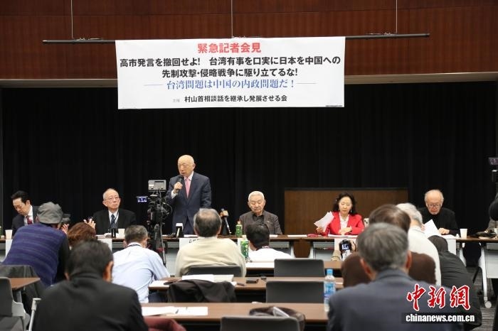12月8日,日本多名學(xué)者及市民團體代表在位于東京的日本參議院議員會館舉行記者會,要求日本首相高市早苗撤回涉臺錯誤言論。圖為“繼承和發(fā)展村山談話會”理事長藤田高景發(fā)言。中新社記者 朱晨曦 攝