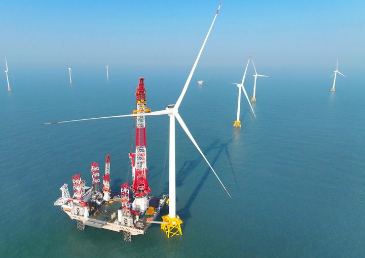 2026年1月13日在福建閩南海域拍攝的“大橋海風”號2000噸自升式海上風電安裝平臺和20兆瓦風電機組吊裝現(xiàn)場(無人機照片)。新華社記者 林善傳 攝