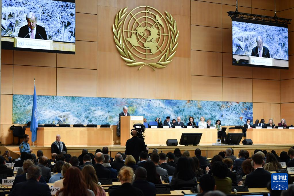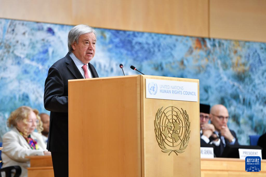 2月23日,在瑞士日內(nèi)瓦萬(wàn)國(guó)宮,聯(lián)合國(guó)秘書(shū)長(zhǎng)古特雷斯在聯(lián)合國(guó)人權(quán)理事會(huì)第61屆會(huì)議上講話。 新華社記者 連漪 攝