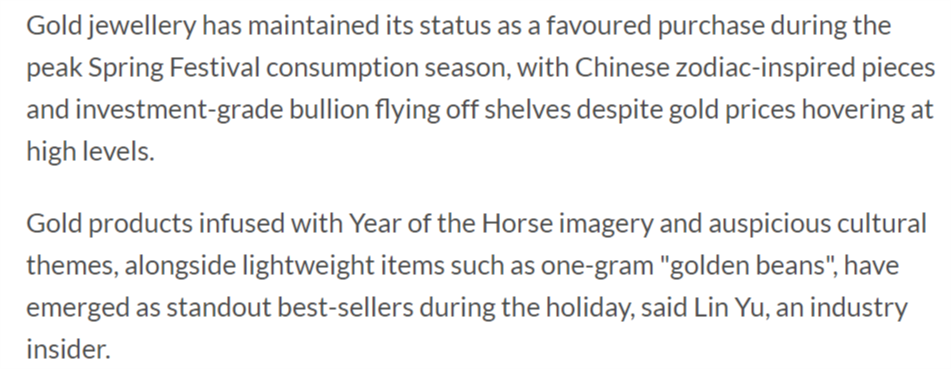 報道還稱,黃金珠寶在春節(jié)消費旺季持續(xù)保持熱門購買地位,盡管金價處于高位,但生肖主題設計的黃金飾品和投資級金條依然暢銷。報道援引業(yè)內人士的話稱,融入馬年元素和吉祥文化主題的黃金產品,以及如一克“金豆”等質量較輕的產品,在節(jié)日期間成為最暢銷的品類。
