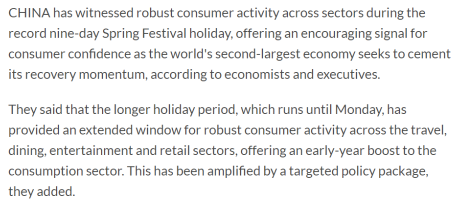 馬來西亞《星報》23日報道稱,在創(chuàng)紀錄的9天春節(jié)假期期間,中國各領域消費活動強勁,這為世界第二大經濟體鞏固復蘇勢頭傳遞了積極信號,也彰顯了消費者信心。