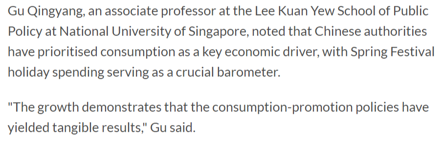 報道援引新加坡國立大學李光耀公共政策學院副教授顧清揚的話表示,中國政府已將消費列為關鍵的經濟驅動力,春節(jié)假期消費則成為重要晴雨表?!霸鲩L表明促消費政策已取得切實成效。”