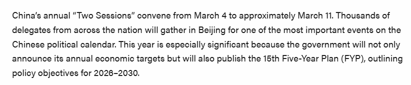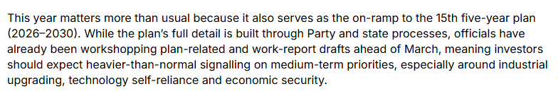 文章說,今年的兩會尤為關(guān)鍵,將為第十五個五年規(guī)劃(2026-2030年)奠定基礎(chǔ)。投資者應(yīng)關(guān)注比往年更明確的政策信號,特別是在產(chǎn)業(yè)升級、科技自主和經(jīng)濟(jì)安全等領(lǐng)域。