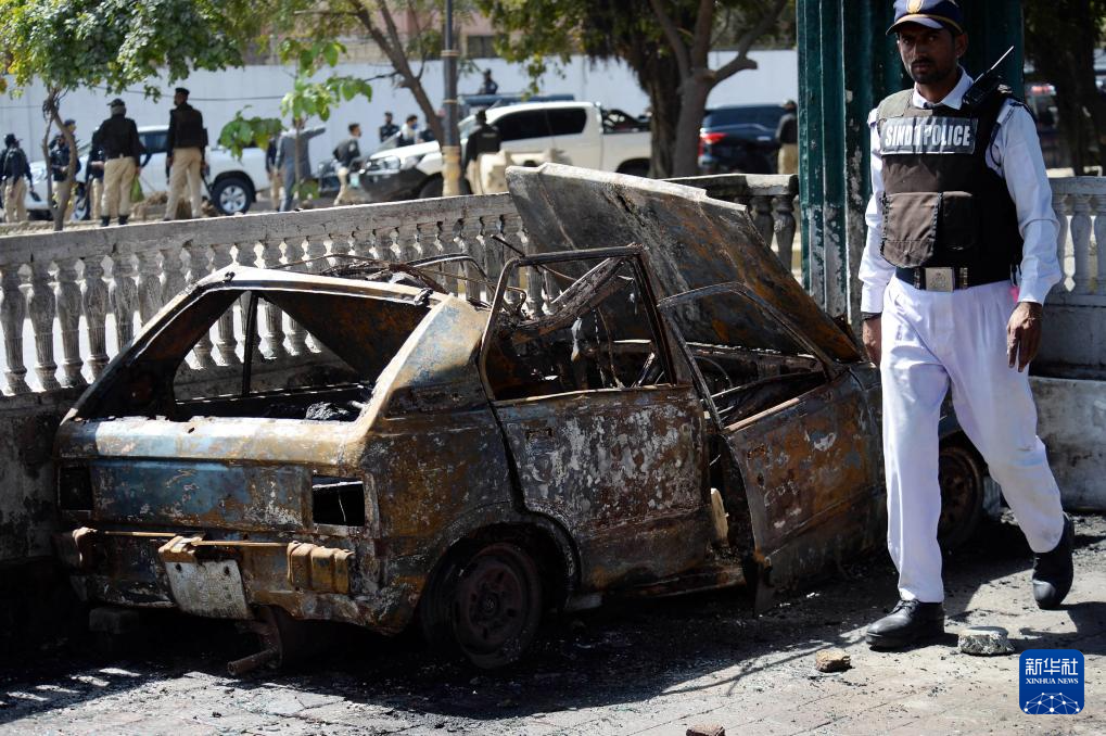 3月1日,在巴基斯坦南部城市卡拉奇的美國駐卡拉奇領事館附近,一名警察經(jīng)過被燒毀的車輛。