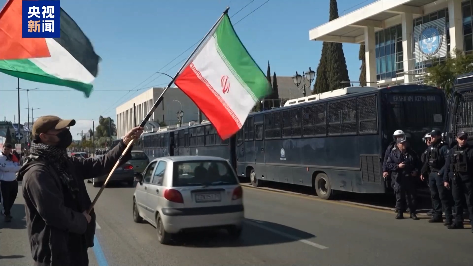 在希臘雅典的美國(guó)和以色列大使館前,逾千名示威者手持伊朗國(guó)旗或標(biāo)語(yǔ)牌、高喊口號(hào)參與游行示威活動(dòng),抗議美以對(duì)伊朗發(fā)動(dòng)襲擊。為維護(hù)現(xiàn)場(chǎng)秩序,當(dāng)?shù)爻鰟?dòng)大量警力并在美國(guó)和以色列大使館前使用一排警用大巴封鎖隔離。