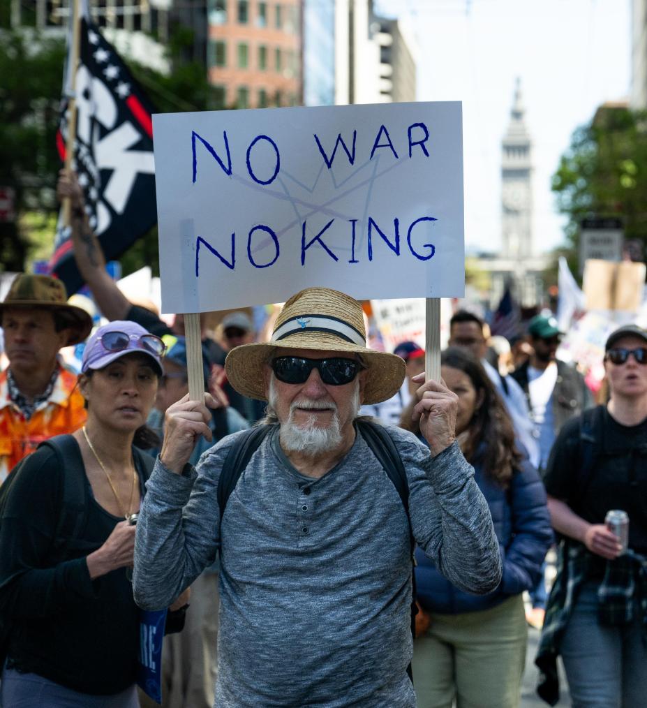 3月28日,人們?cè)诿绹?guó)加利福尼亞州舊金山參加“不要國(guó)王”抗議活動(dòng)。新華社發(fā)(朱子于攝)