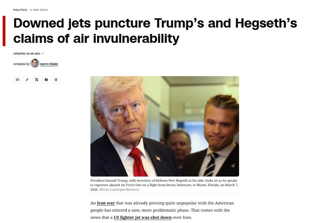伊朗在24小時(shí)內(nèi)先后擊落美軍一架戰(zhàn)斗機(jī)和一架攻擊機(jī),引起美國(guó)國(guó)內(nèi)震動(dòng)。文章認(rèn)為,這并不意味著伊朗的軍事實(shí)力突然能與美國(guó)平起平坐。然而,在這場(chǎng)以“軍事壓倒性優(yōu)勢(shì)”為美國(guó)主要籌碼的沖突中,此次事件凸顯了非對(duì)稱戰(zhàn)爭(zhēng)的風(fēng)險(xiǎn),而美國(guó)民眾早已不愿為此買單。同時(shí),這也戳穿了美國(guó)政府“完全掌控伊朗空域”的說(shuō)法,以及過(guò)去一個(gè)月來(lái)試圖營(yíng)造的“固若金湯”的假象。