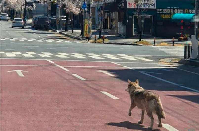 當(dāng)?shù)貢r(shí)間4月8日,大田消防部門(mén)提供的照片顯示,這匹在逃狼在大街上行走。圖源:韓媒