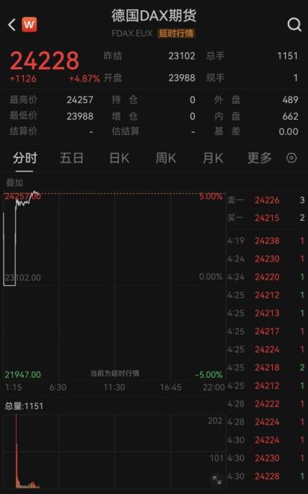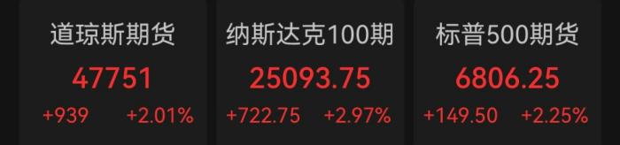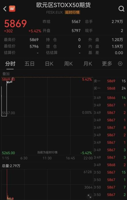 歐美市場期貨同步上漲,歐元區(qū)斯托克50指數(shù)期貨上漲超5.5%,德國DAX期貨最高漲超5%。美股三大指數(shù)期貨均漲超2%,其中納斯達(dá)克100期貨小型最多漲超3%。