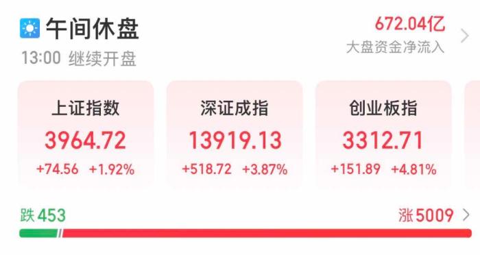 受投資者情緒提振,亞洲股市今早開盤后同步暴漲。午間休盤,A股三大股指仍全部上漲,上證指數(shù)最高漲近2%,深證成指最高漲幅達(dá)3.87%,創(chuàng)業(yè)板指數(shù)漲4.81%。午間休盤前,股市中仍有超5000只個(gè)股上漲。