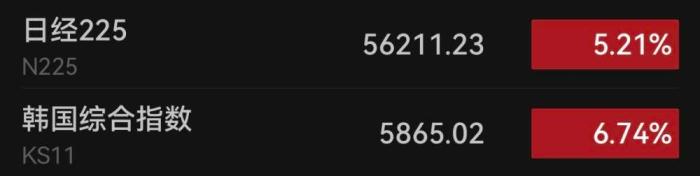 截至8日13:00,日經(jīng)225指數(shù)盤中漲幅超5%,最高報(bào)56304.49點(diǎn)。韓國綜合指數(shù)一度漲幅超7%,最高報(bào)5882.91點(diǎn),且仍在持續(xù)走高中。據(jù)韓聯(lián)社報(bào)道,韓國綜合股價(jià)指數(shù)(KOSPI)和創(chuàng)業(yè)板指數(shù)(KOSDAQ)開盤后雙雙大漲,一度同時(shí)觸發(fā)暫停程序化交易的“臨時(shí)停牌”(Sidecar)機(jī)制。