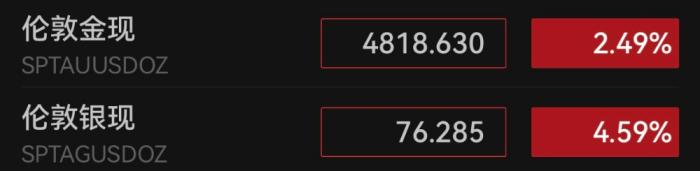 國際貴金屬市場并未因?;鹣⒍禍兀炊@著走高。截至8日13:00,倫敦金現(xiàn)盤中大漲超過3%,再度漲超4850美元/盎司;國際銀價(jià)大漲,倫敦銀現(xiàn)盤中漲幅近6%,突破77美元/盎司。