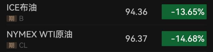 伴隨股市大漲,國際油價(jià)、貴金屬價(jià)格也出現(xiàn)大幅波動。國際市場原油價(jià)格“高臺跳水”,截至8日13:00,WTI原油期貨盤中一度跌幅超過19%,跌破每桶100美元關(guān)口,達(dá)91.05美元/桶。布倫特原油期貨一度跌超16%,達(dá)最低91.7美元/桶。