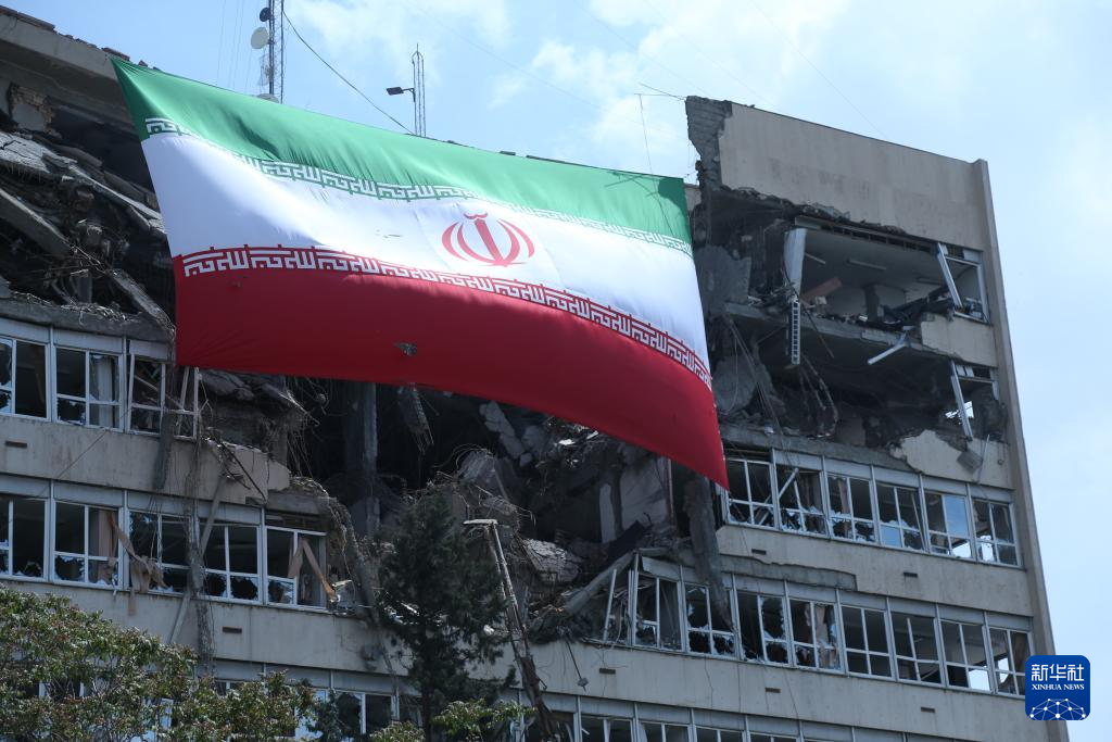 4月20日,在伊朗首都德黑蘭,伊朗國旗懸掛在遭美以襲擊被嚴(yán)重?fù)p毀的建筑上。