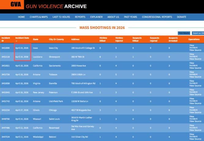 僅4月19日一天,便有數(shù)起大規(guī)模槍擊案發(fā)生。其中一起發(fā)生在當(dāng)日凌晨愛荷華大學(xué)附近。此次事件造成5人受傷,其中3人為該校學(xué)生。