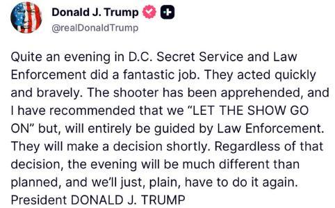 特朗普隨后在社交媒體上說,一名涉事槍手已被拘捕,他“已建議‘活動(dòng)照常進(jìn)行’,但最終將完全遵從執(zhí)法部門的安排……無論最終決定如何,今晚的活動(dòng)安排都將和原定計(jì)劃有很大不同。我們后續(xù)需要重新舉辦這場活動(dòng)”。