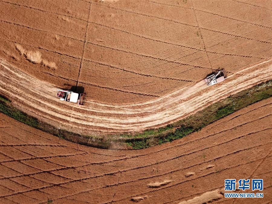 6月2日,在合肥市蜀山區(qū)小廟鎮(zhèn)馬崗村,農(nóng)機(jī)手操作機(jī)械設(shè)備收割小麥(無人機(jī)照片)。 “三夏”時(shí)節(jié),安徽各地麥?zhǔn)者M(jìn)入高峰期,農(nóng)民搶收小麥,確保顆粒歸倉。新華社記者劉軍喜攝