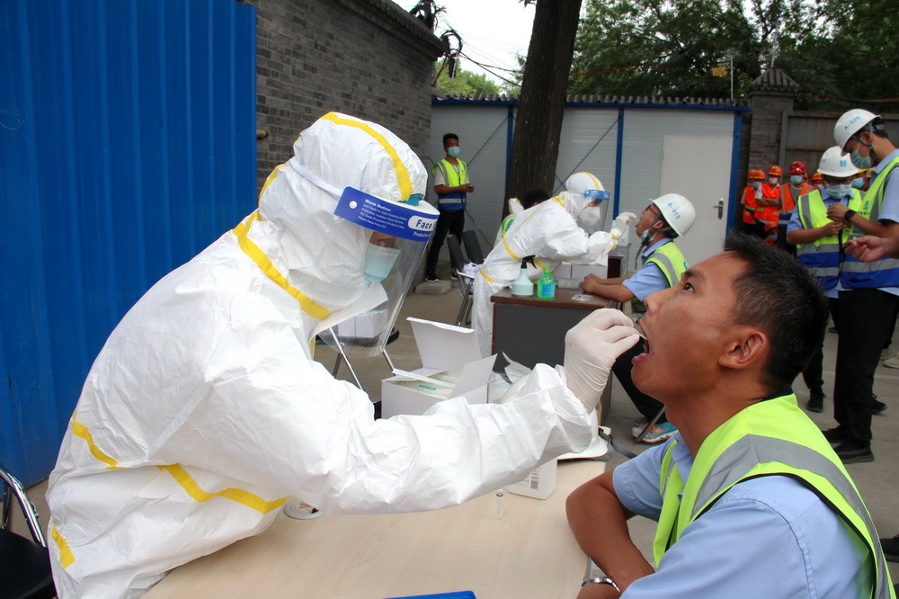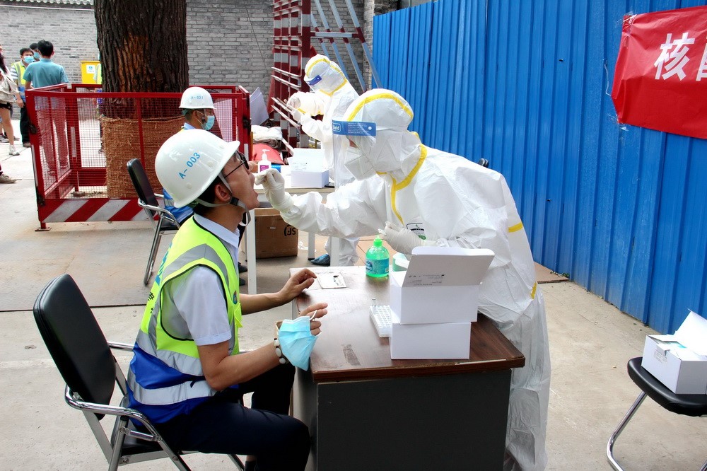 6月15日至17日,中建三局北京公司在京1042名職工做完核酸檢測,同時公司邀請專業(yè)機(jī)構(gòu)為在建項目的上萬名勞務(wù)工人、安保及物業(yè)管理人員提供上門核酸檢測。新華社發(fā)(柯玉乾攝)