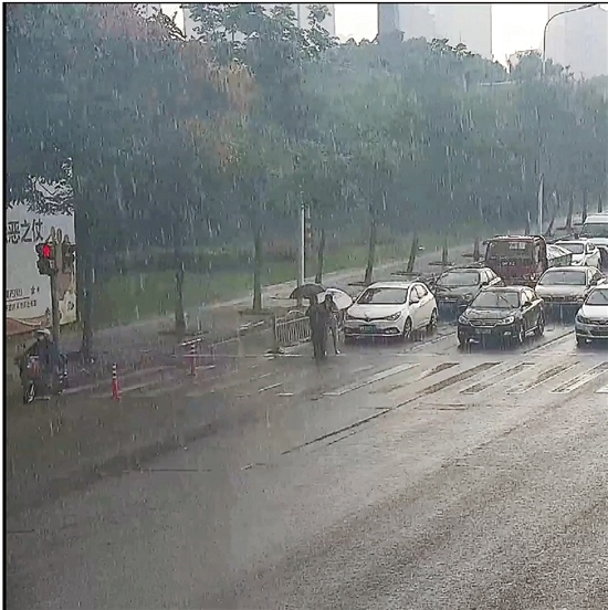 當(dāng)老人好不容易快走到馬路對面時,天公不作美,突然下起瓢潑大雨,又一幕感人的瞬間出現(xiàn)了:一輛等候通行的小轎車上下來一名女司機(jī),從后備廂拿出一把雨傘后,快步跑上前,遞到老人手里。