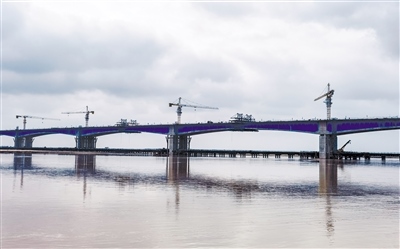 10月5日凌晨,由內(nèi)蒙古高路公司投資,中交二公局承建,包茂高速公路昭君黃河特大橋主橋雙幅順利合龍。昭君黃河特大橋橫亙于黃河,氣勢宏偉,蔚為壯觀,大橋采用雙向4車道高速公路標準建設,全長4300米,分北岸灘橋、北岸跨堤橋、主橋、南岸灘橋、南岸跨堤橋五部分。(王曉博 攝)