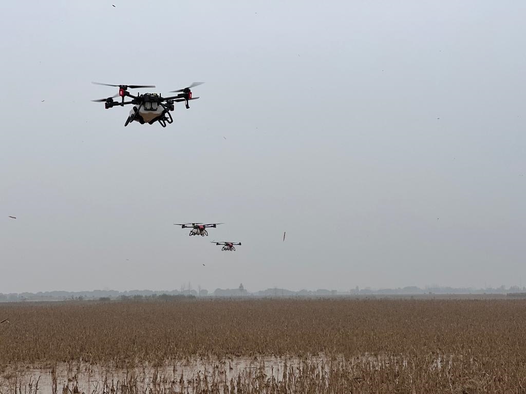 11月8日拍攝的陜西省渭南市華州區(qū)無(wú)人機(jī)飛播現(xiàn)場(chǎng)。