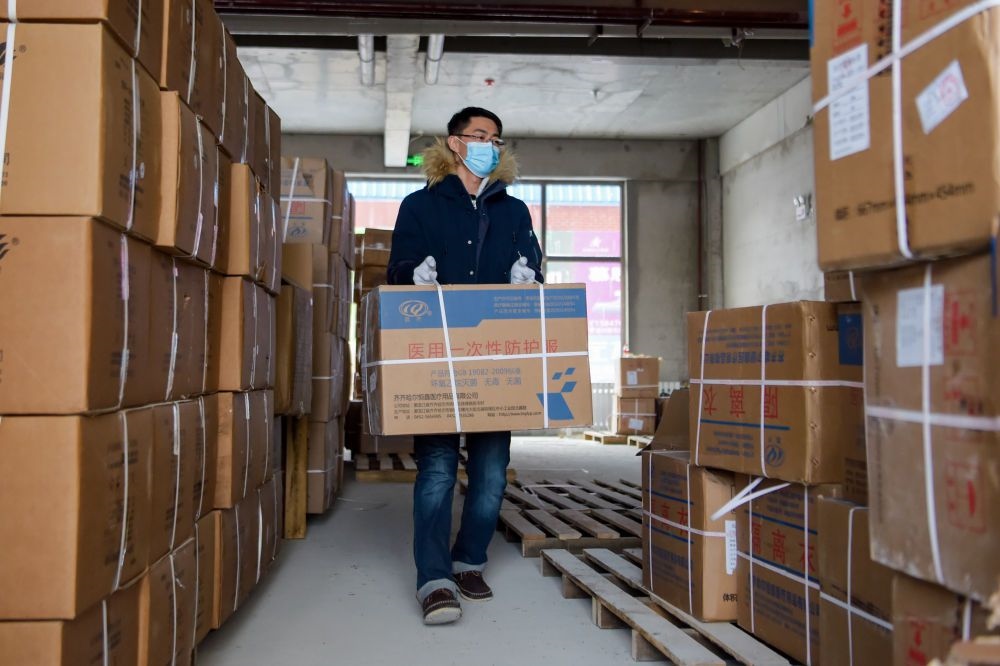 在位于滿洲里市臚臏社區(qū)的臨時(shí)物資存放點(diǎn),工作人員在搬運(yùn)防疫物資。新華社記者 李志鵬 攝