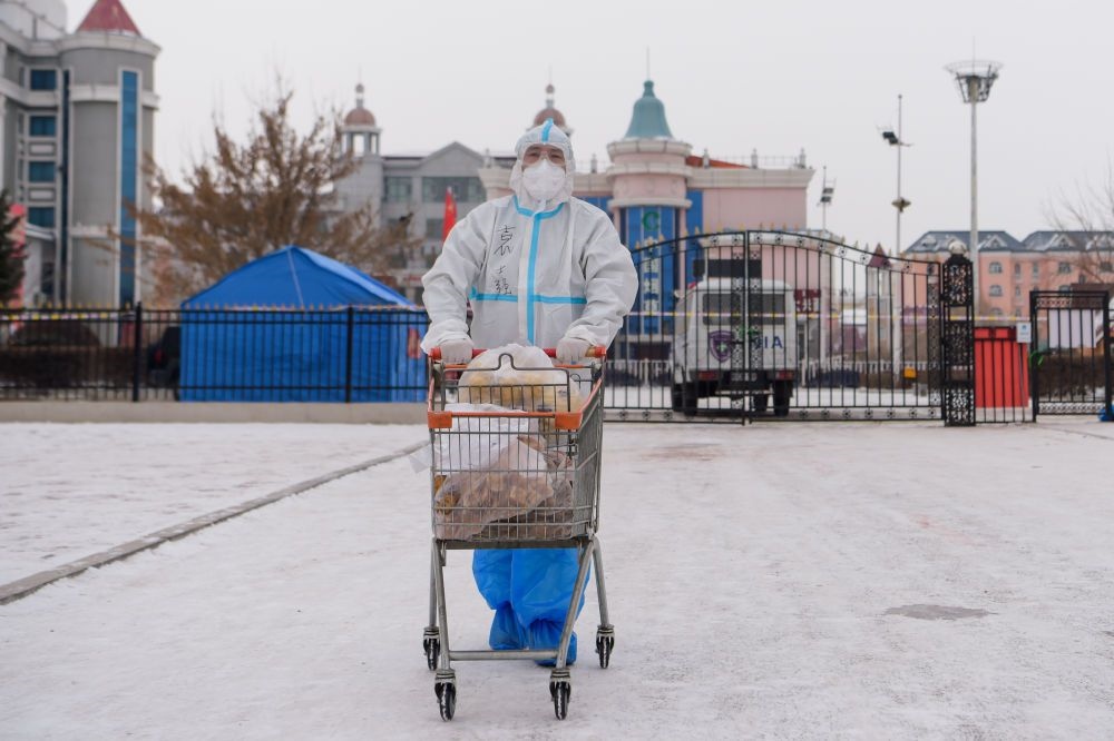 在滿洲里市府欣小區(qū),工作人員運(yùn)送物資。新華社記者 李志鵬 攝