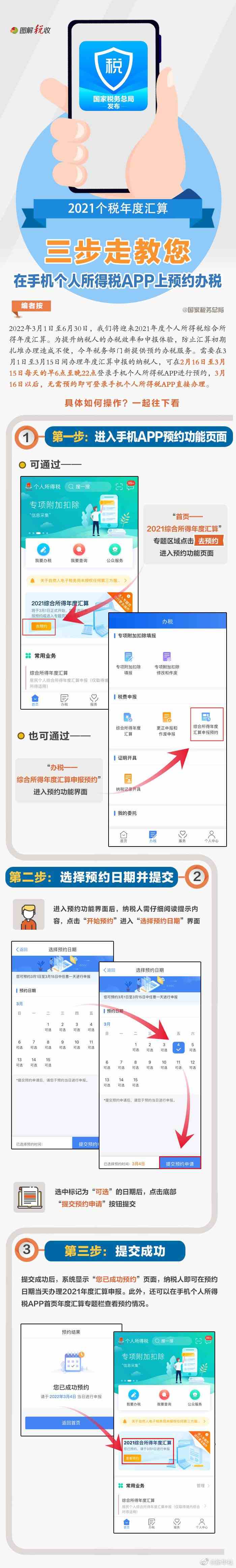 2022年3月1日至6月30日,我們將迎來2021年度個(gè)人所得稅綜合所得年度匯算。為提升納稅人的辦稅效率和申報(bào)體驗(yàn),今年稅務(wù)部門新提供預(yù)約辦稅服務(wù)。如何通過個(gè)人所得稅APP進(jìn)行預(yù)約辦稅?很簡單,三步走,手把手教你輕松搞定,看圖了解↓(記者 王雨蕭;圖片來源:國家稅務(wù)總局)