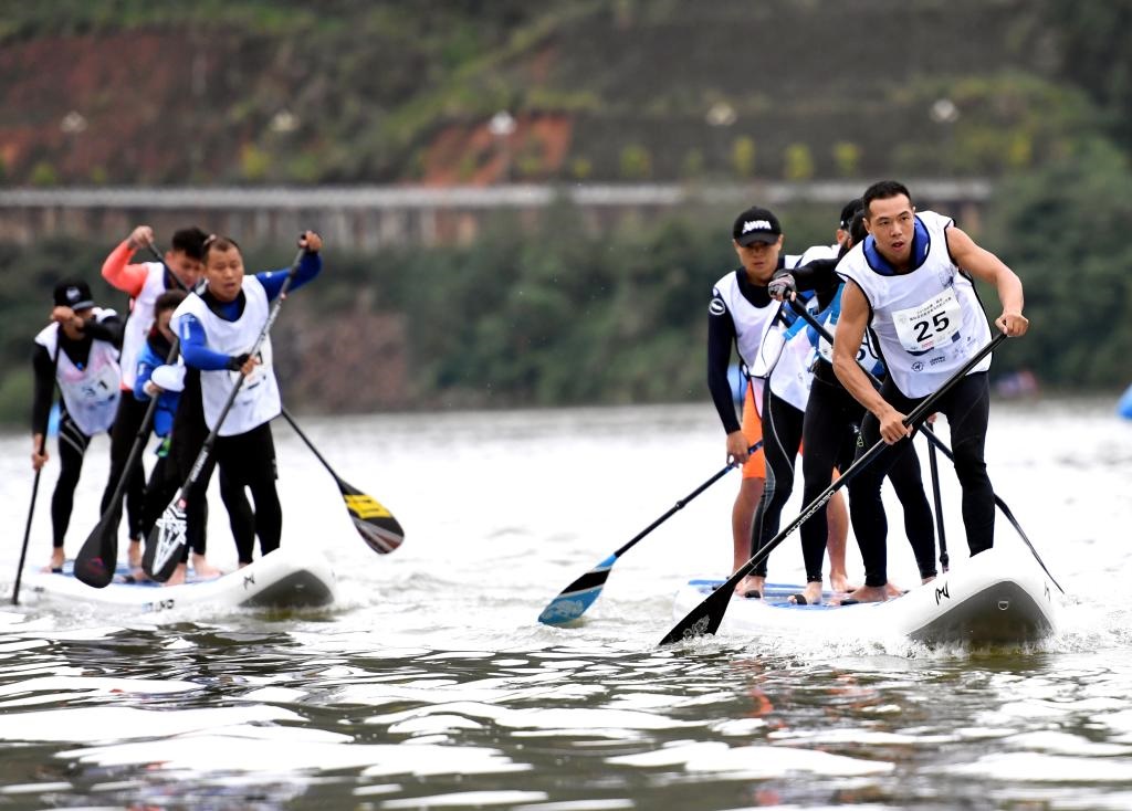 2018年11月18日,參賽選手在槳板團體賽決賽中。當日,2018年中國·將樂國際皮劃艇槳板馬拉松公開賽在福建省將樂縣落幕。新華社記者彭張青攝