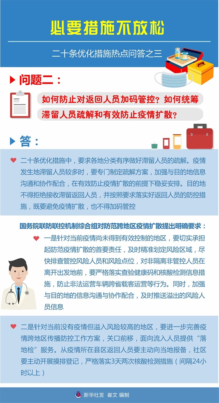 答:二十條優(yōu)化措施中,要求各地分類有序做好滯留人員的疏解。疫情發(fā)生地滯留人員較多時,要專門制定疏解方案,加強與目的地信息溝通和協(xié)作配合,在有效防止疫情擴散的前提下穩(wěn)妥安排。目的地不得拒絕接收滯留返回人員,并按照要求落實好返回人員的防控措施,既要避免疫情擴散,也不得加碼管控。