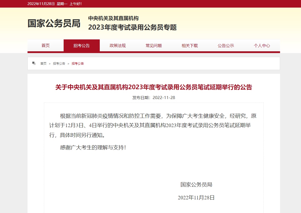 ??根據(jù)當前新冠肺炎疫情情況和防控工作需要,為保障廣大考生健康安全,經(jīng)研究,原計劃于12月3日、4日舉行的中央機關(guān)及其直屬機構(gòu)2023年度考試錄用公務員筆試延期舉行,具體時間另行通知。
