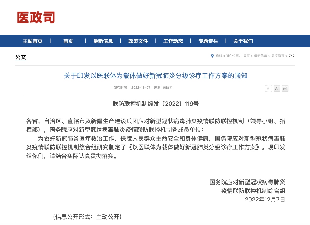 新華社北京12月7日電 為做好新冠肺炎醫(yī)療救治工作,全力保障高齡合并基礎(chǔ)疾病等重癥風(fēng)險較高的感染者及時救治,構(gòu)建更加科學(xué)有序的就醫(yī)秩序,國務(wù)院聯(lián)防聯(lián)控機制綜合組12月7日發(fā)布《以醫(yī)聯(lián)體為載體做好新冠肺炎分級診療工作方案》。