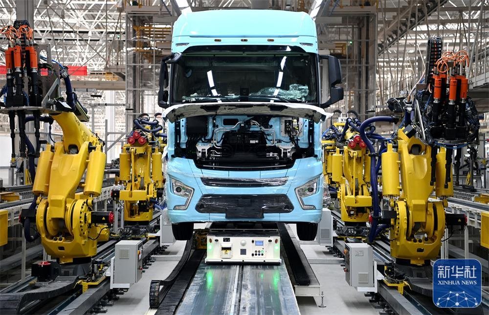 在陜汽重卡擴(kuò)能項(xiàng)目現(xiàn)場,一輛重卡在汽車總裝生產(chǎn)線輪胎自動化裝配擰緊無人工作站進(jìn)行裝配(9月27日攝)。新華社記者 劉瀟 攝