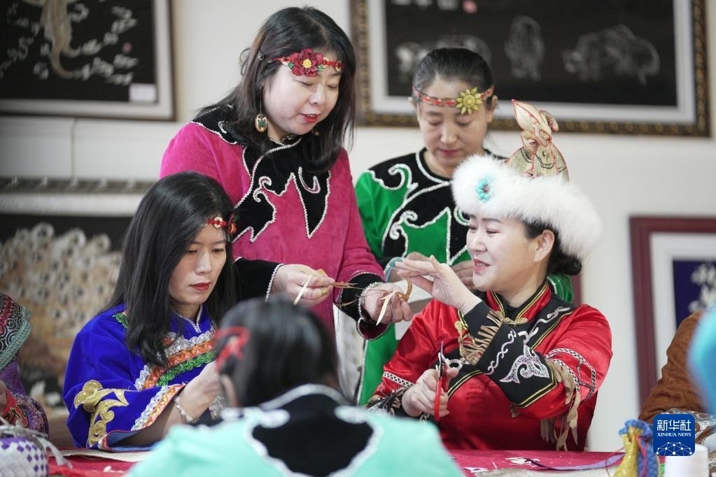 2月22日,在黑龍江省同江市非物質(zhì)文化遺產(chǎn)展示館,劉蕾(右一)在學(xué)習(xí)魚(yú)皮制作技藝。新華社記者 王建威 攝