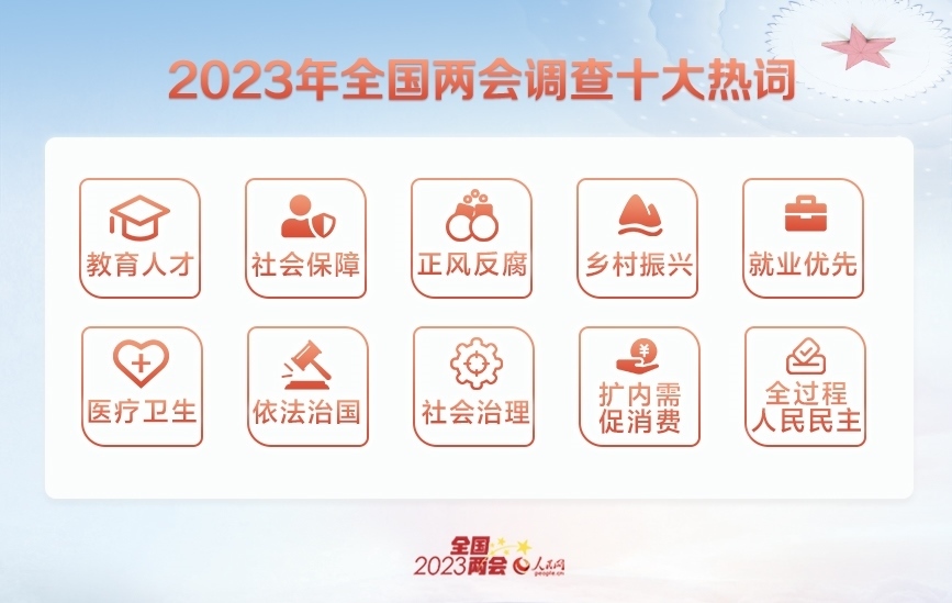 經(jīng)過網(wǎng)友投票,“教育人才”“社會(huì)保障”“正風(fēng)反腐”“鄉(xiāng)村振興”“就業(yè)優(yōu)先”“醫(yī)療衛(wèi)生”“依法治國”“社會(huì)治理”“擴(kuò)內(nèi)需促消費(fèi)”“全過程人民民主”入選十大熱詞。