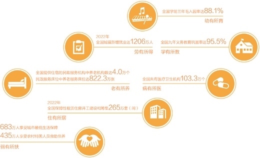 實(shí)實(shí)在在的舉措,帶來了實(shí)實(shí)在在的成效。城鄉(xiāng)學(xué)前教育公共服務(wù)體系基本建成,學(xué)前三年毛入園率由2011年的62.3%提高到2021年的88.1%。堅(jiān)持政府舉辦義務(wù)教育,九年義務(wù)教育鞏固率達(dá)95.5%,初中在校生5120.6萬人,普通小學(xué)在校生10732.0萬人;實(shí)施就業(yè)優(yōu)先戰(zhàn)略,確保就業(yè)局勢總體穩(wěn)定,2022年城鎮(zhèn)新增就業(yè)達(dá)1206萬人,脫貧人口務(wù)工規(guī)模3278萬人,100個城市公共就業(yè)服務(wù)機(jī)構(gòu)求人倍率為1.46,繼續(xù)保持在1以上,崗位供給大于求職人數(shù);著力解決群眾看病難、看病貴問題,人民健康水平穩(wěn)步提升,全國共有醫(yī)療衛(wèi)生機(jī)構(gòu)103.3萬個,醫(yī)療衛(wèi)生機(jī)構(gòu)床位975萬張,參加基本醫(yī)療保險(xiǎn)人數(shù)達(dá)到134570萬人;不斷推進(jìn)養(yǎng)老事業(yè)和養(yǎng)老產(chǎn)業(yè)協(xié)同發(fā)展,養(yǎng)老服務(wù)體系更加健全,全國提供住宿的民政服務(wù)機(jī)構(gòu)中養(yǎng)老機(jī)構(gòu)達(dá)4.0萬個,民政服務(wù)床位中養(yǎng)老服務(wù)床位達(dá)822.3萬張;加快推進(jìn)住房保障和供應(yīng)體系建設(shè),2022年全年全國各類棚戶區(qū)改造開工134萬套,基本建成181萬套,全國保障性租賃住房開工建設(shè)和籌集265萬套(間),群眾居住條件不斷改善;扎實(shí)做好因疫因?yàn)?zāi)遇困群眾和老弱病殘等特殊群體的基本生活保障,2022年年末,683萬人享受城市最低生活保障,435萬人享受農(nóng)村特困人員救助供養(yǎng),全年臨時救助1083萬人次,保障網(wǎng)越織越密實(shí)。