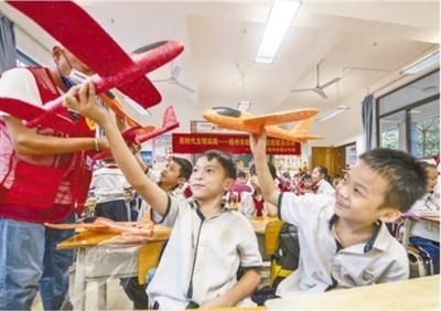 廣西壯族自治區(qū)梧州市的一所小學(xué)內(nèi),學(xué)生正在上趣味航模科技課。何華文攝(影像中國)