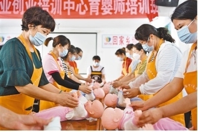 湖北省襄陽市??悼h就業(yè)創(chuàng)業(yè)培訓(xùn)中心,學(xué)員在育嬰師培訓(xùn)班上練習(xí)新生兒護(hù)理技能。楊 韜攝(影像中國)