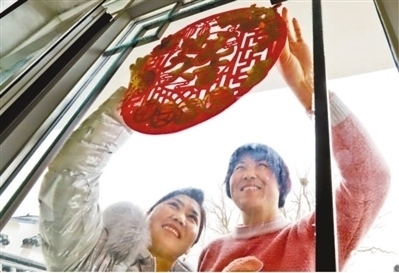 甘肅省張掖市臨澤縣鴨暖鎮(zhèn)屯泉小鎮(zhèn)彩蝶灣社區(qū),剛剛遷進(jìn)新居的村民在窗戶上貼窗花。王 將攝(影像中國)