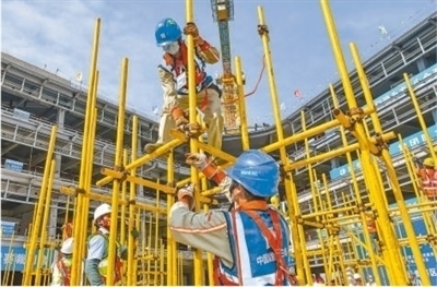 海南省建筑業(yè)職工職業(yè)技能競賽暨質(zhì)量安全現(xiàn)場觀摩交流會現(xiàn)場,建筑工人正在進(jìn)行架體搭設(shè)競賽。康登淋攝(影像中國)