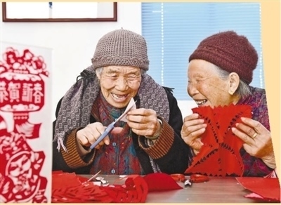 山東省日照市嵐山區(qū)虎山鎮(zhèn)黃家峪村養(yǎng)老服務(wù)中心,兩位老人邊剪紙邊聊天。新華社記者 郭緒雷攝