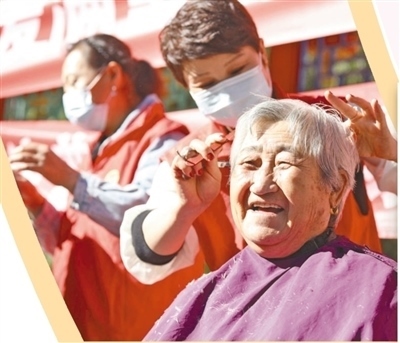 河北省唐山市豐潤區(qū)燕山路街道欣園社區(qū),志愿者為老人免費(fèi)理發(fā)。朱大勇攝(人民視覺)