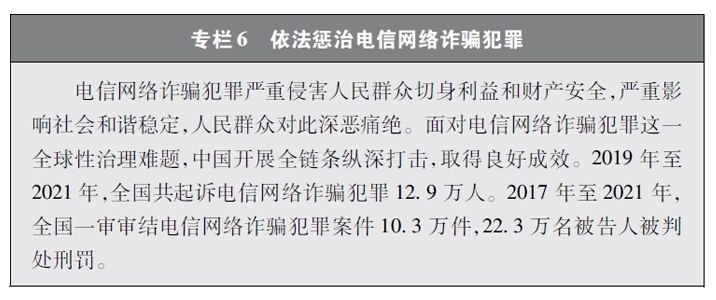 加大網(wǎng)絡(luò)犯罪懲治力度。隨著互聯(lián)網(wǎng)技術(shù)的快速發(fā)展,傳統(tǒng)犯罪加速向以互聯(lián)網(wǎng)為媒介的非接觸式犯罪轉(zhuǎn)變,電信網(wǎng)絡(luò)詐騙、網(wǎng)絡(luò)賭博、網(wǎng)絡(luò)淫穢色情等涉網(wǎng)違法犯罪多發(fā)。中國依法辦理新型網(wǎng)絡(luò)犯罪案件。連續(xù)多年開展“凈網(wǎng)行動”,嚴(yán)厲打擊群眾反映強烈的黑客攻擊破壞、侵犯公民個人信息等違法犯罪活動。持續(xù)推進“云劍”“斷卡”“斷流”“拔釘”等專項行動,打擊套路貸、校園貸、“以房養(yǎng)老”、“投資養(yǎng)老”等電信網(wǎng)絡(luò)詐騙犯罪,依法懲處為電信網(wǎng)絡(luò)詐騙犯罪團伙提供互聯(lián)網(wǎng)接入、域名注冊、服務(wù)器托管、移動互聯(lián)網(wǎng)應(yīng)用程序制作開發(fā)、網(wǎng)絡(luò)支付、引流推廣等服務(wù)支撐的黑灰產(chǎn)業(yè)。完善國家反詐大數(shù)據(jù)平臺和反詐移動互聯(lián)網(wǎng)應(yīng)用程序,建設(shè)國家涉詐黑樣本庫,完善快速止付凍結(jié)機制、涉詐資金返還機制。堅決打擊網(wǎng)絡(luò)賭博犯罪行為,從嚴(yán)治理網(wǎng)絡(luò)淫穢色情。網(wǎng)絡(luò)犯罪治理工作取得明顯成效,人民群眾安全感有效提升,社會更加和諧穩(wěn)定。