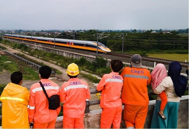 在印度尼西亞萬隆,雅萬高鐵建設(shè)者和當(dāng)?shù)孛癖娪^看高速鐵路綜合檢測車行駛在雅萬高鐵試驗(yàn)段(無人機(jī)照片)。新華社發(fā)(李培養(yǎng) 攝)