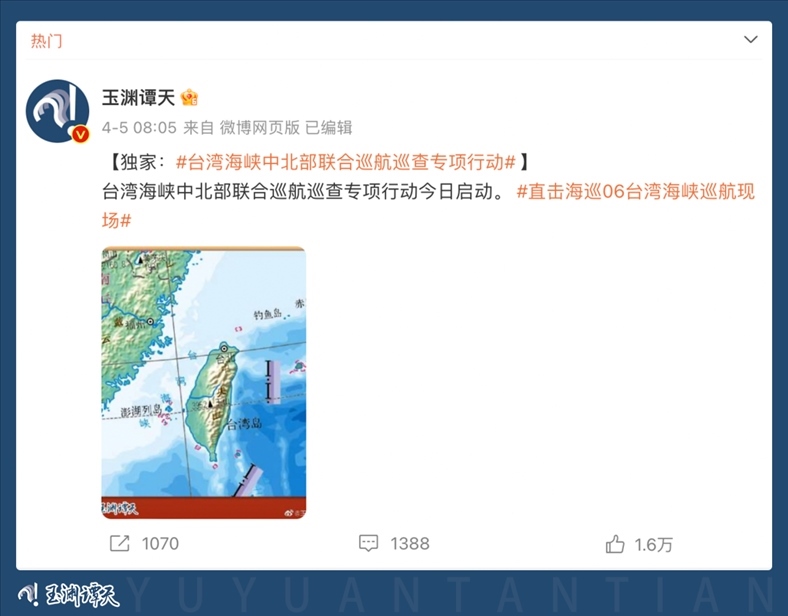 多家主流媒體轉(zhuǎn)發(fā)引用,消息瞬間傳遍全網(wǎng)。90余家臺(tái)灣媒體多平臺(tái)轉(zhuǎn)發(fā),揣測(cè)此次巡航活動(dòng)及玉淵譚天配圖釋放的信號(hào)。臺(tái)當(dāng)局就此消息進(jìn)行緊急回應(yīng),美國(guó)之音也撰文評(píng)論。