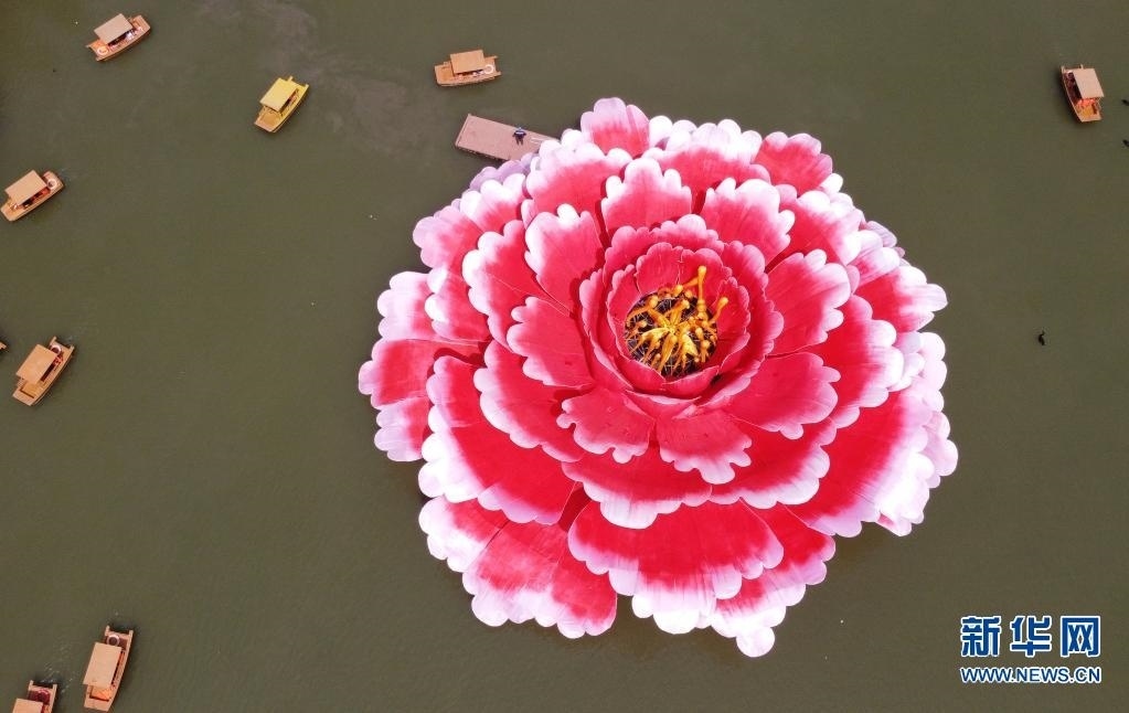 近日,在河南省洛陽市隋唐城遺址植物園,一座直徑36米、高13米的巨型牡丹景觀造型亮相滴翠湖,吸引游客前來觀賞。