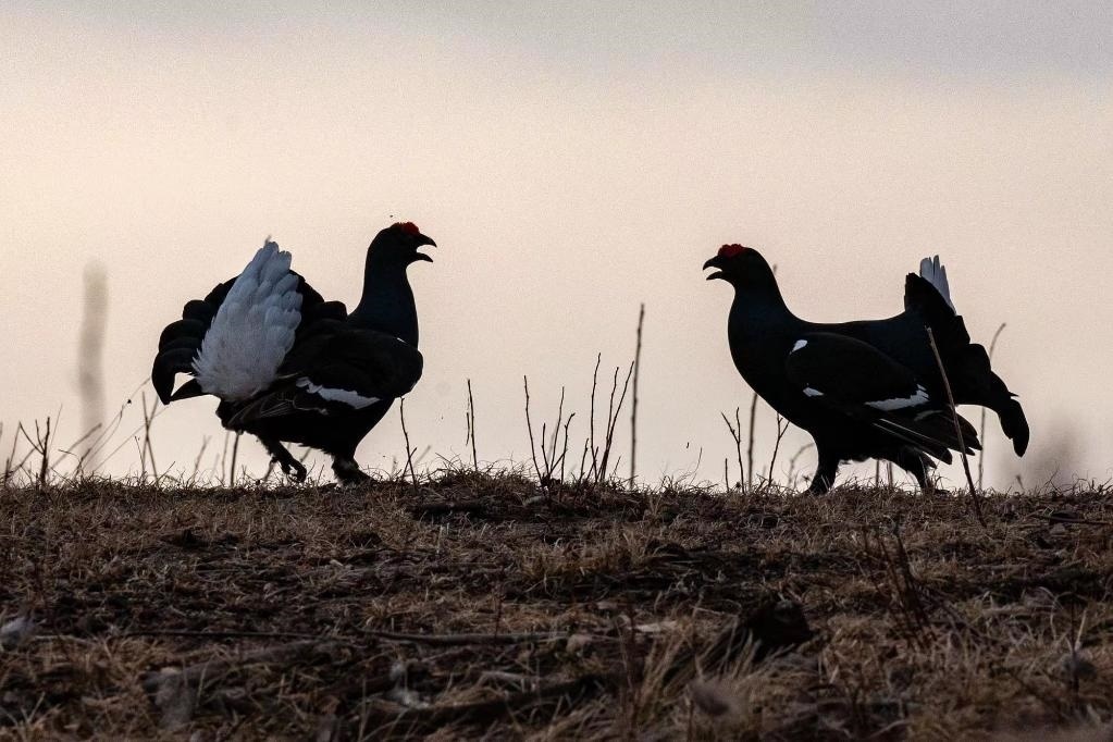 近來每天早上,天剛蒙蒙亮,黑琴雞就聚集在林間草地打斗。它們時(shí)而追逐對峙,時(shí)而鐵嘴啄眼,時(shí)而吼聲低沉,時(shí)而銳爪封喉,激烈的打斗場面吸引了眾多攝影愛好者和觀賞者。